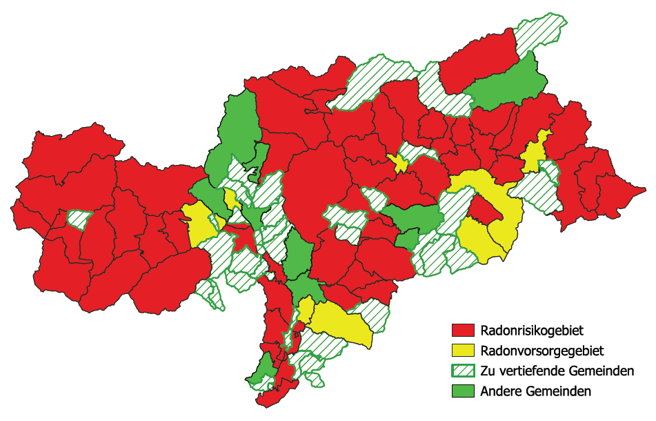 Anfang Februar sind für Südtirol die Radon-Risikozonen die sog. „aree prioritarie“ veröffentlicht worden. Eine Vielzahl an Gemeinden wurden, aufgrund der Messungen der letzten 20 Jahre, als Radon-Risikogemeinden klassifiziert.
